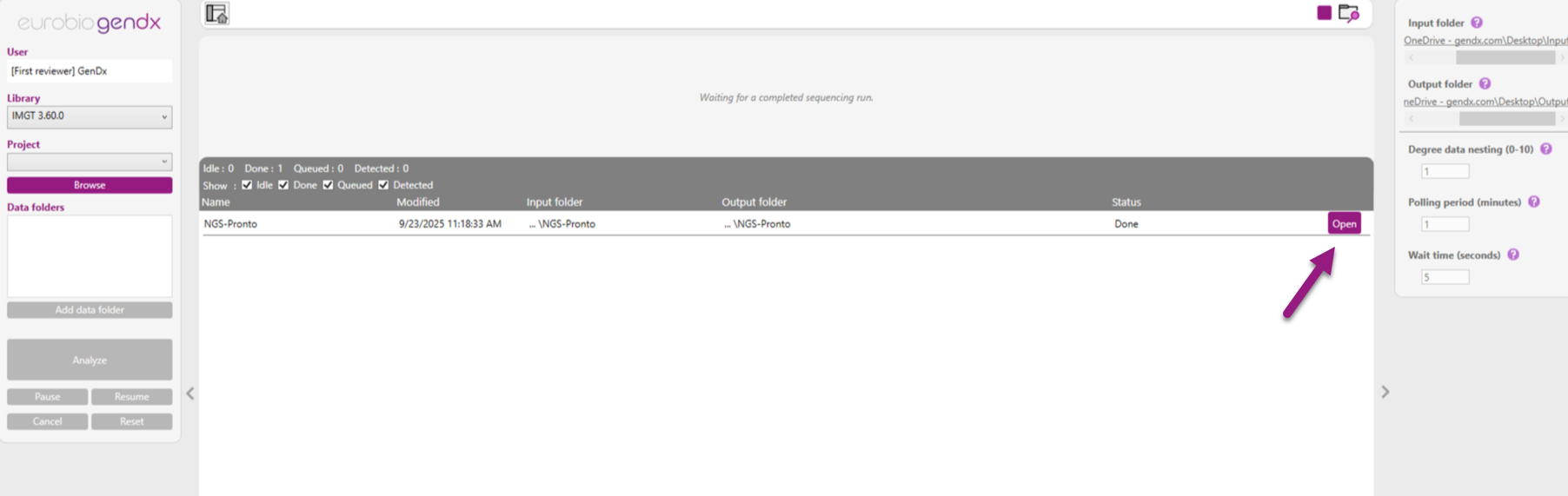 If a new data folder is detected, a job will be created with status “Detected”. This means that the software has recognized a file that is valid for further processing. After detection, the file enters the analysis pipeline. The green progress bar shows how much of the analysis is complete.
