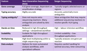 While performance may vary depending on assay design, laboratory workflow, and clinical context, employing NGS-based HLA typing can provide many benefits over Sanger-based HLA typing, as summarized in the table below. Note that the information provided below is tailored to short-read NGS using sequencing-by-synthesis technology.